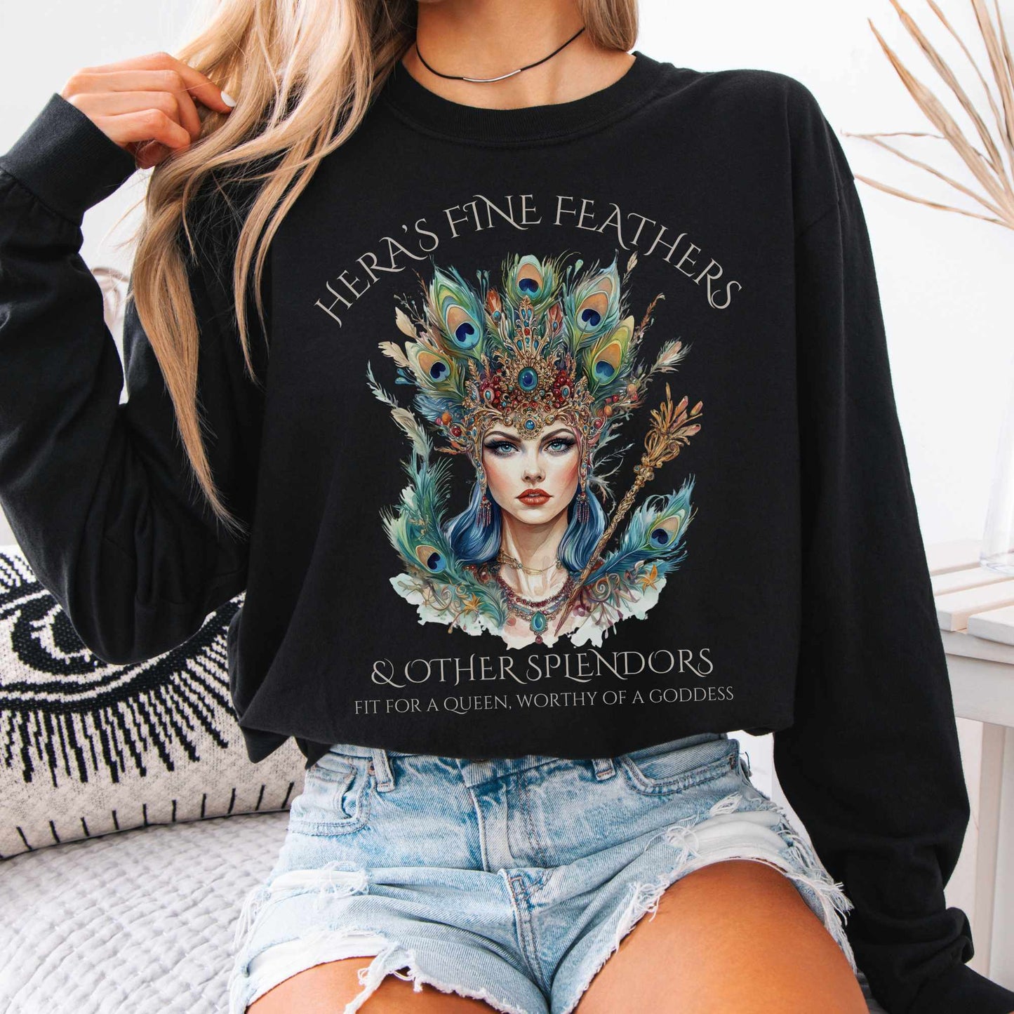 Embrace the regal elegance of the Hera’s Fine Feathers long sleeved shirt! ✨ This mesmerizing design captures the queen of the gods adorned in her radiant glory. With a stunning crown of vivid peacock feathers, intricate jewels, and a staff fit for royalty, Hera embodies power, beauty, and divine splendor. The phrase “Fit for a Queen, Worthy of a Goddess” perfectly encapsulates this enchanting piece.