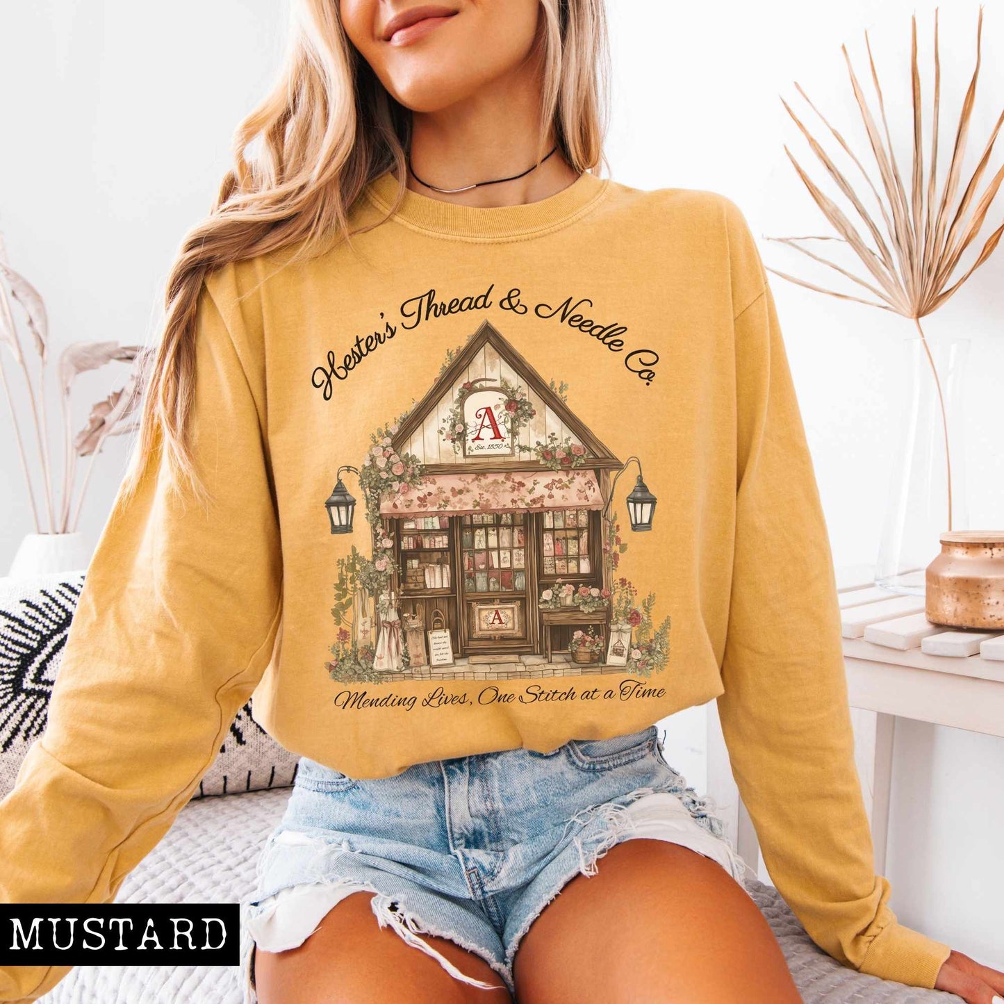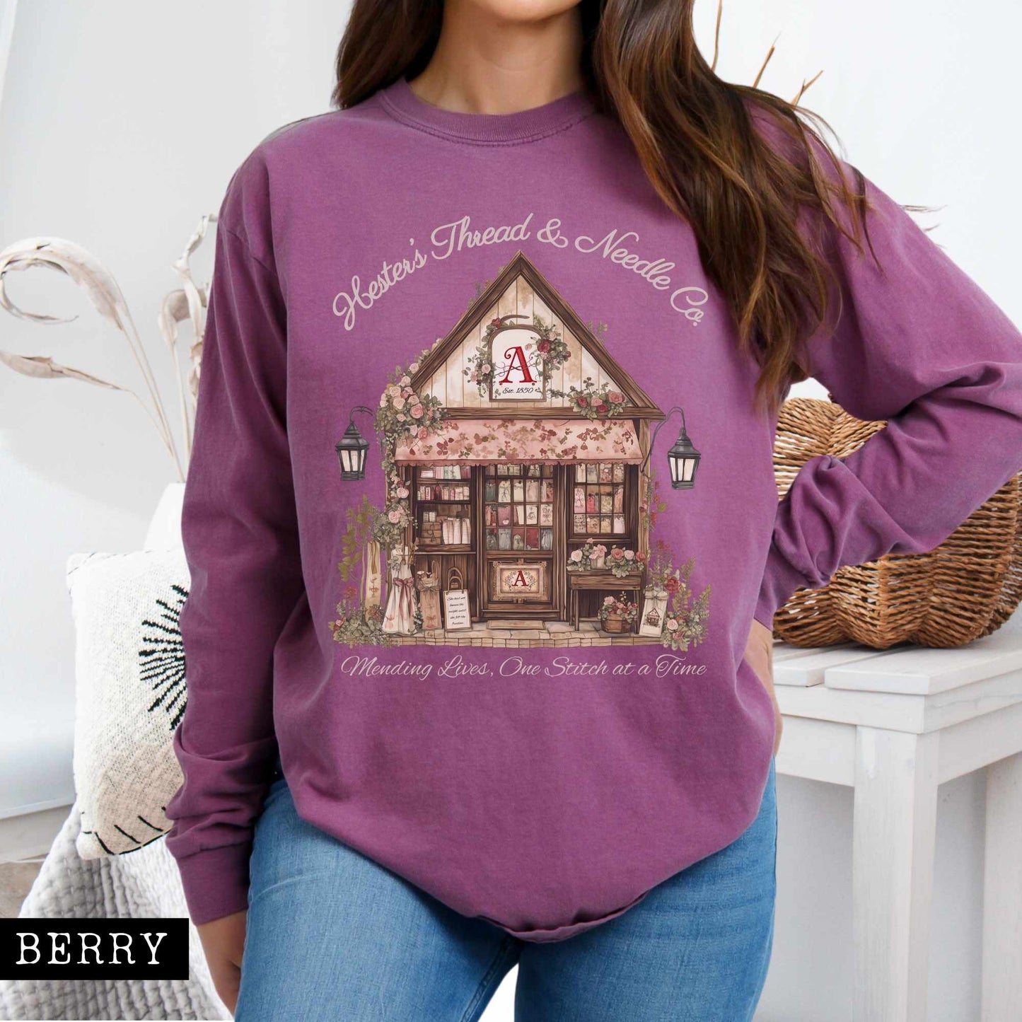 Hester’s Thread & Needle Co. long sleeved t-shirt weaves a tale of resilience and transformation, inspired by Nathaniel Hawthorne’s The Scarlet Letter. 🧵 This charming design features a quaint sewing shop adorned with roses and ivy, its windows brimming with bolts of fabric, spools of thread, and baskets of textiles. The bold "A" above the door nods to Hester Prynne’s iconic mark of strength and redemption. The tagline, “Mending Lives, One Stitch at a Time,” reflects Hester’s journey of reclaiming her identity through her artistry.