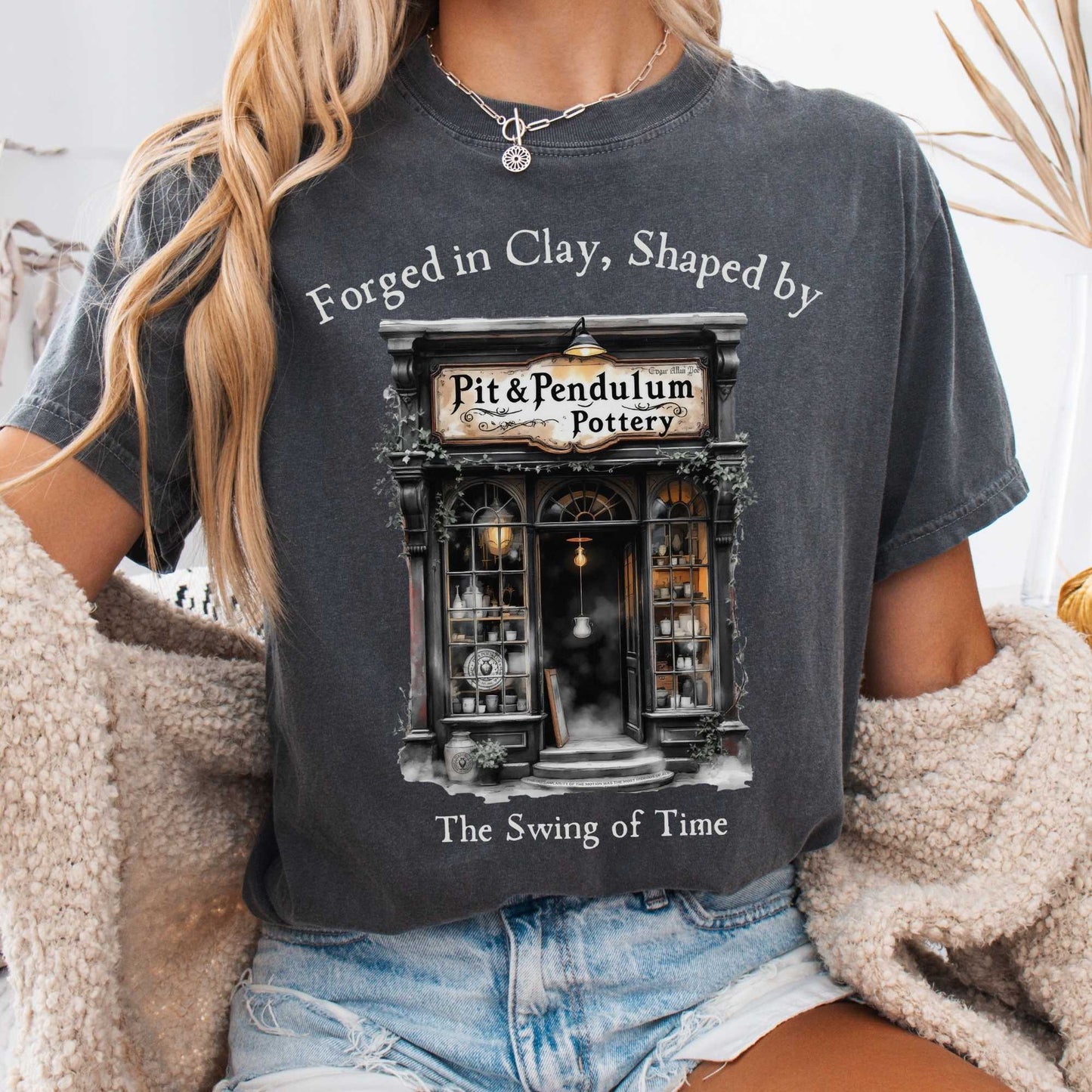 Immerse yourself in the chilling ambiance of Edgar Allan Poe with our "Pit & Pendulum Pottery" t-shirt. Inspired by Poe's gripping tale, "The Pit and the Pendulum," this design showcases a hauntingly beautiful pottery shop front, evoking the story's themes of time and fate. Adorned with the phrases "Forged in Clay, Shaped by Time" and "The Swing of Time," it serves as a metaphor for the inexorable march of time and the craftsmanship of life's experiences.